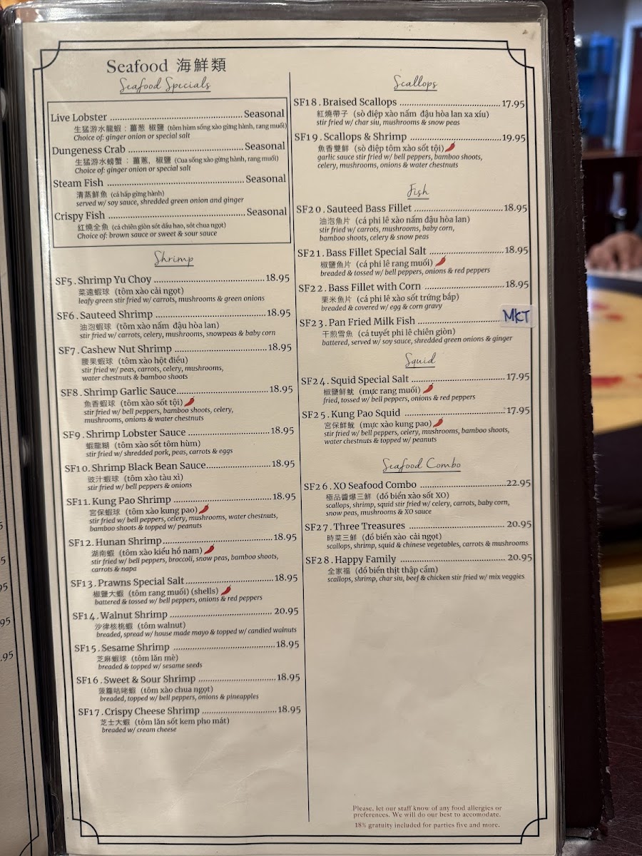 海鮮炒(撈) 麵 Choice of: Crispy Egg Noodles or Lo Mein Crispy Egg Noodles: featuring shrimp, scallops, squid and crab meat stir-fried with crisp vegetables in a light sauce, served over a bed of golden, pan-fried crispy noodles. (carrots, broccoli, napa, mushroom) Lo Mein: hearty stir-fry of shrimp, scallops, squid and crab meat tossed with soft egg noodles (carrots, green onions, onions, bean sprouts)