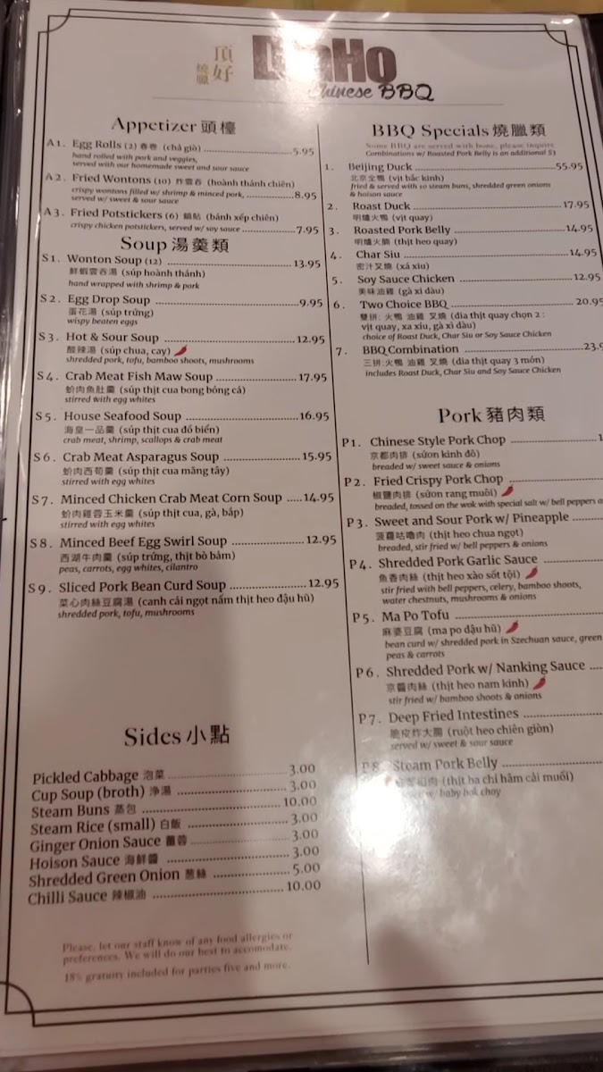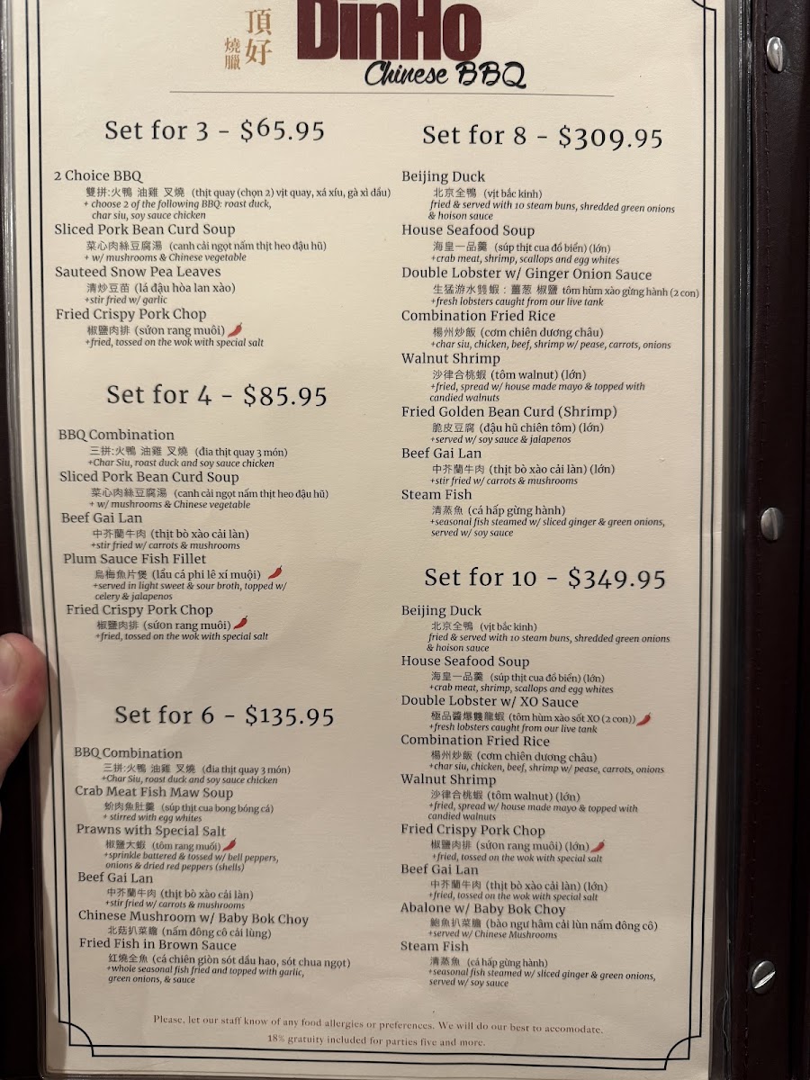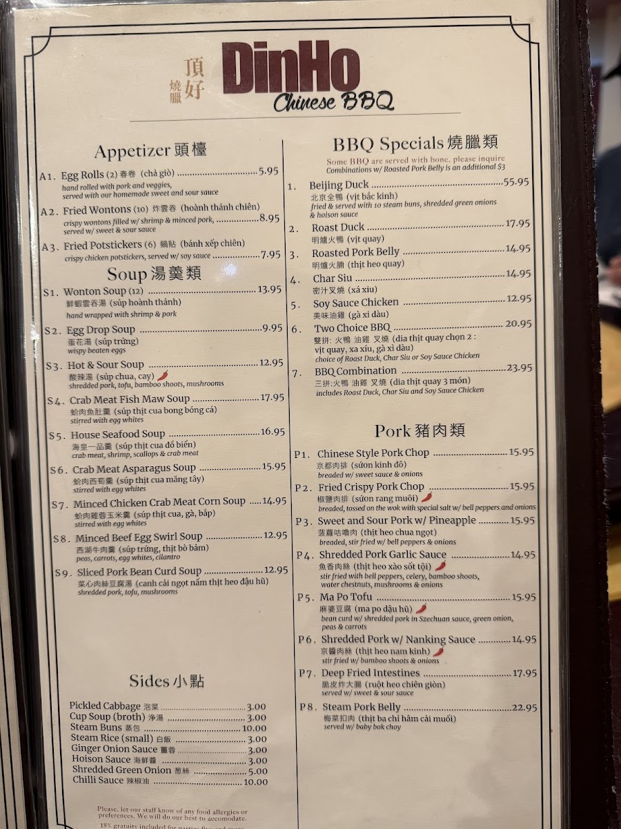 三拼:火鴨 油雞 义燒 Mouthwatering selection of authentic Chinese BBQ favorites: Juicy Roast Duck, Char Siu (Chinese BBQ pork) glazed in a sweet and savory marinade, and sweet soy sauce marinated Chicken. OR choose Roasted Pork Belly, crunchy golden skin with savory meat and hoisin sauce dip