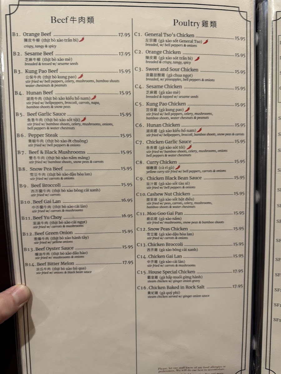 湖南牛 Sliced beef stir-fried with fresh vegetables in a bold, spicy Hunan-style sauce—fiery, savory, and full of rich flavor. (bell peppers, broccoli, carrots, napa, bamboo shoots & snow peas, spicy)